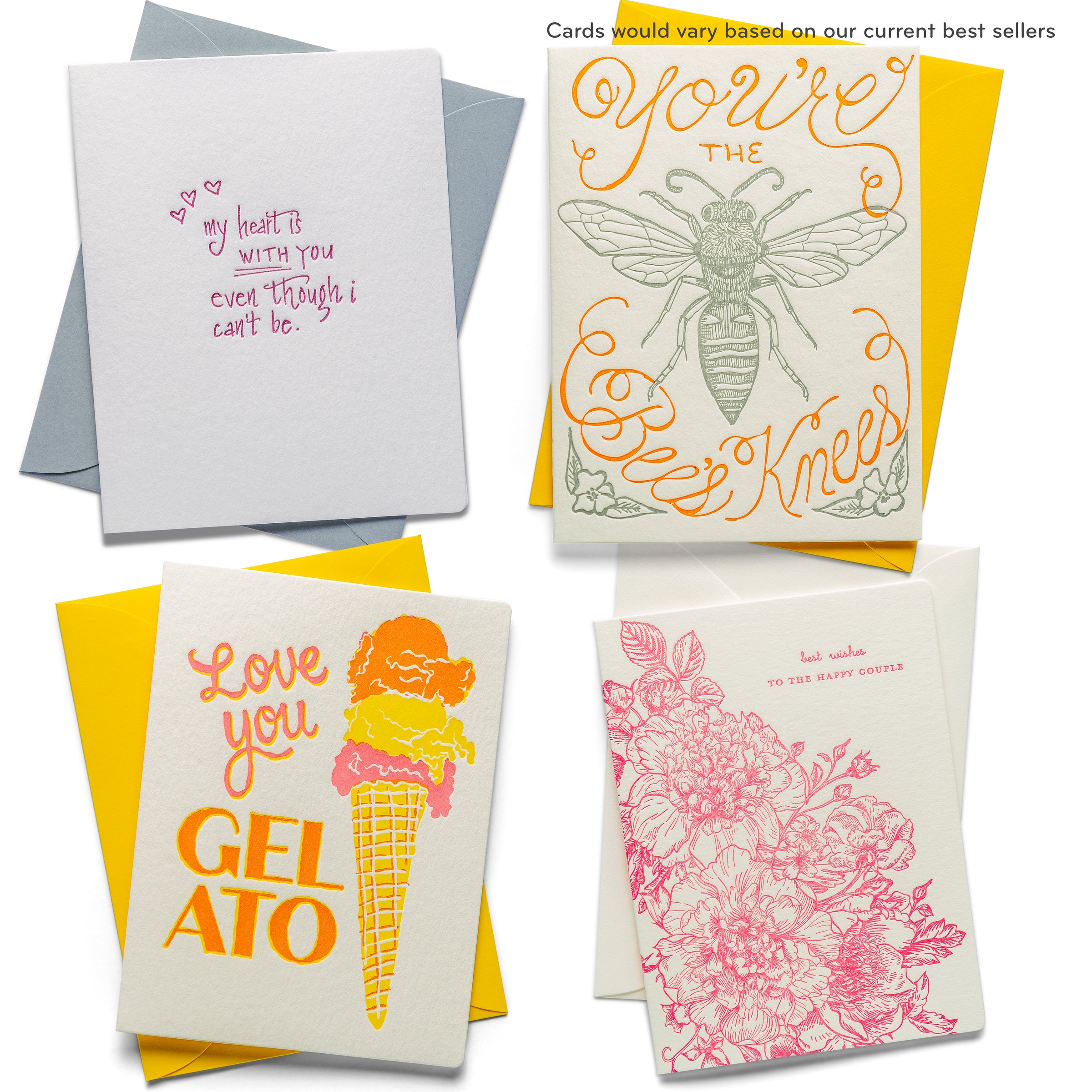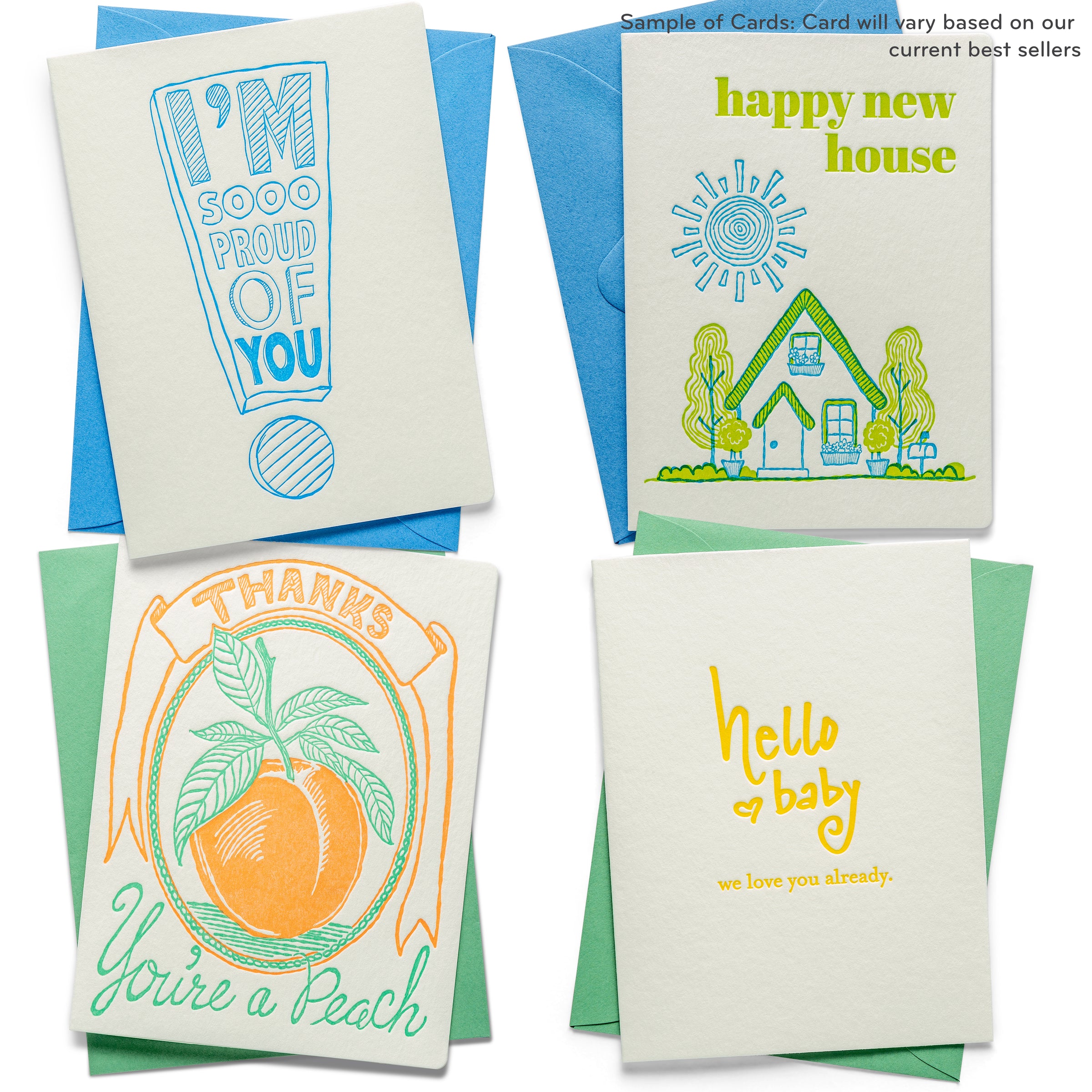 Each pack includes 35 Letterpress Greeting Cards, thoughtfully curated from our current best sellers. The images shown are examples of what you might receive, and every assortment will include: