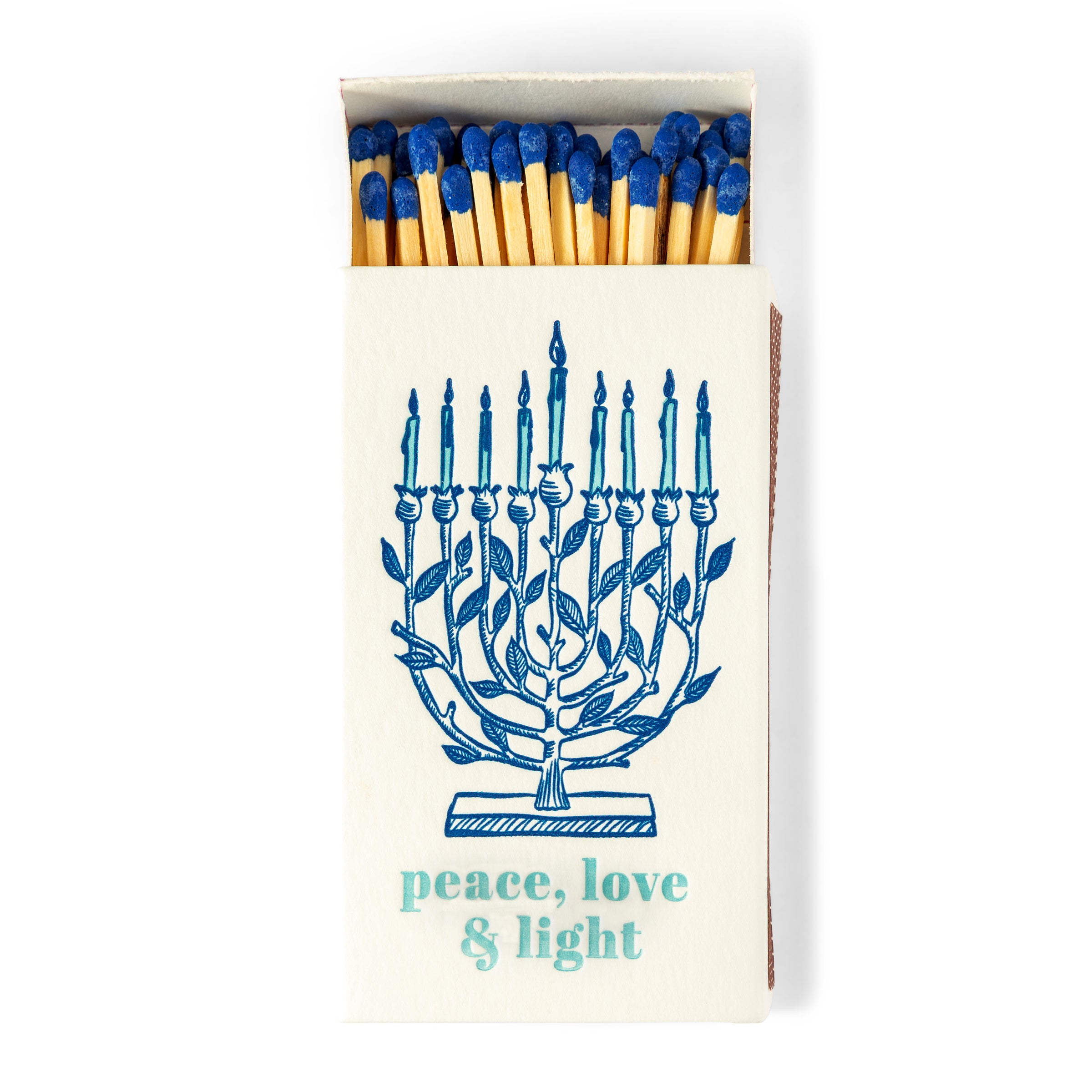 Celebrate the season with peace, love, & light. This menorah matchbox features a beautiful branch-style design, letterpress printed in rich shades of blue. It’s a meaningful & elegant touch for Hanukkah gatherings—perfect for lighting candles or gifting with intention.