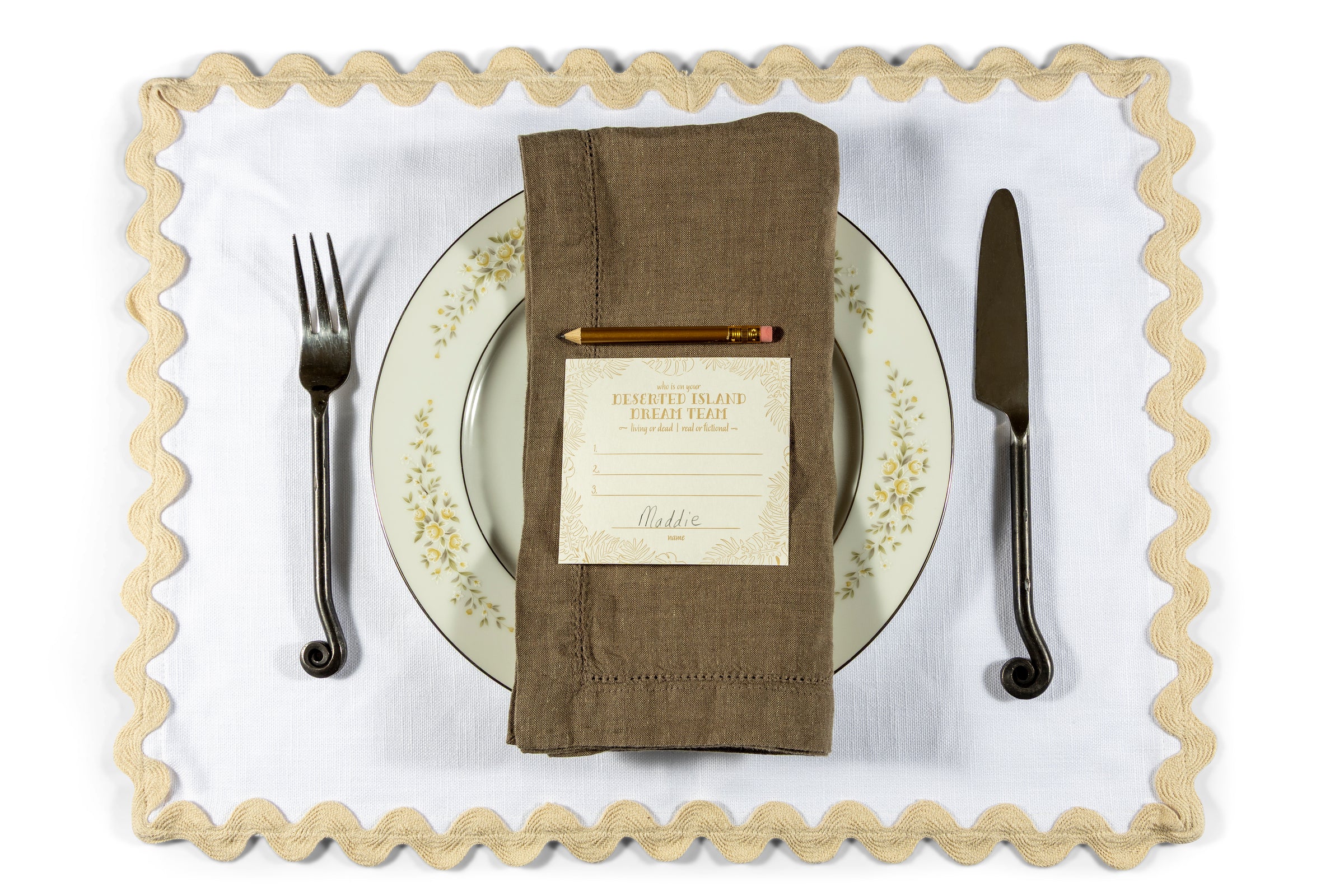 Who is on your deserted island dream team? Inspired by cultivating traditions and connections, our interactive dinner party place cards are designed to encourage memory making during the holidays and special occasions. These classy place cards with their matching mini gold pencils not only help with seating arrangements but also add a beautiful touch to your table settings and help spark dinner time conversations.