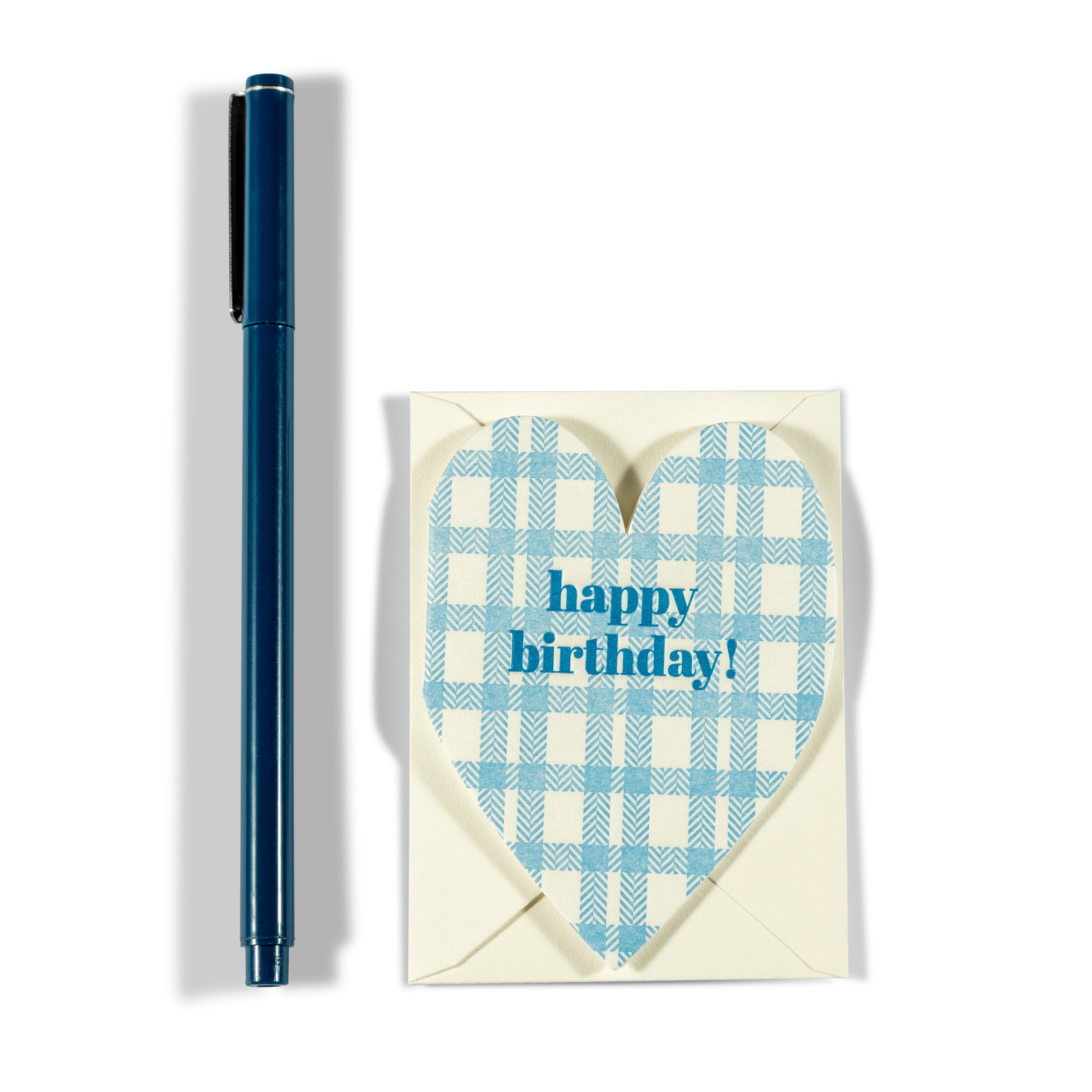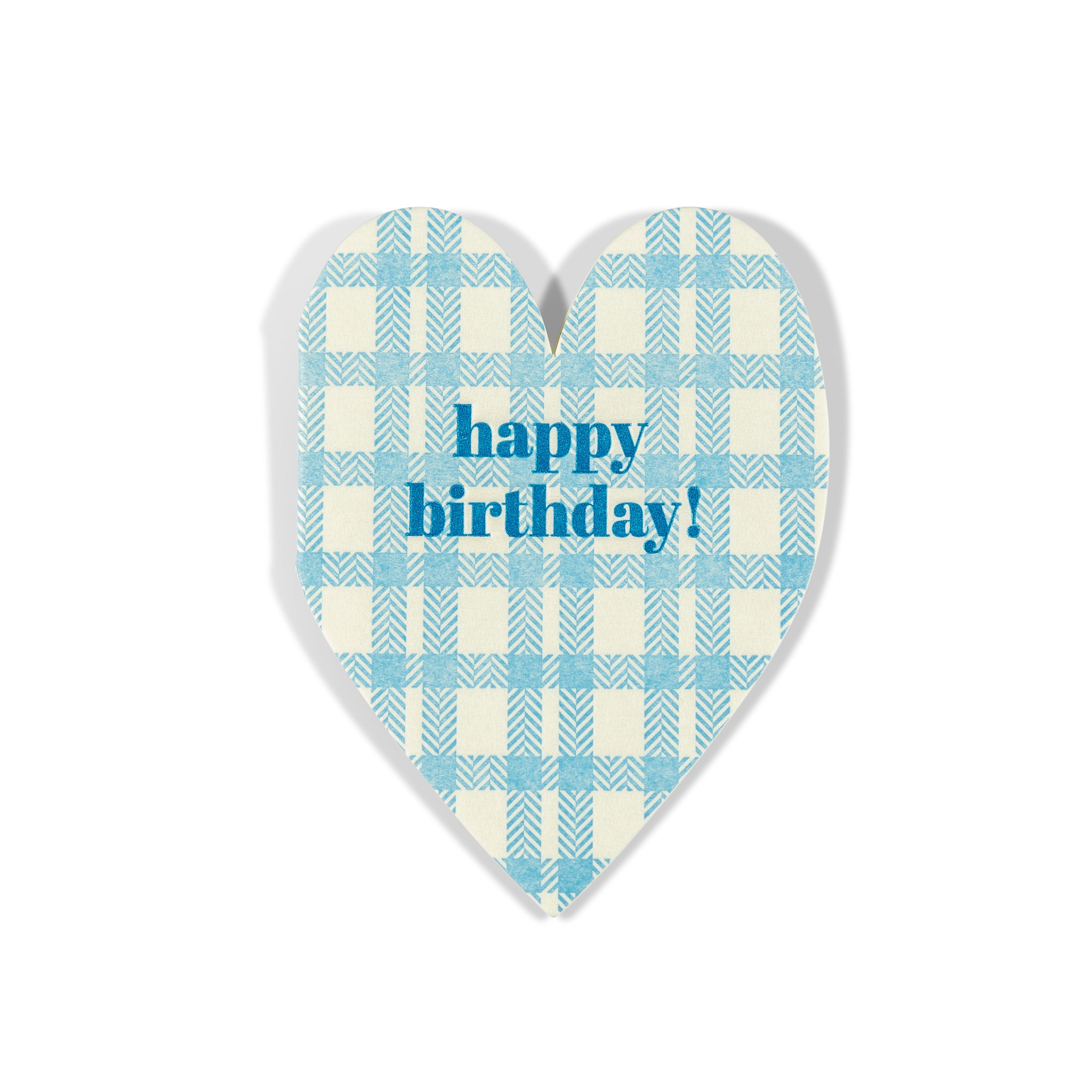 A sweet little card with a pop of pattern.This heart-shaped mini features a soft blue plaid backdrop and a cheerful “happy birthday!” message—perfect for adding a thoughtful touch to any birthday gift, treat bag, or bouquet. Each card comes with a matching envelope (2.625” x 3.625”), just the right size to tuck inside a present or deliver by hand. Too small to mail, but full of charm.