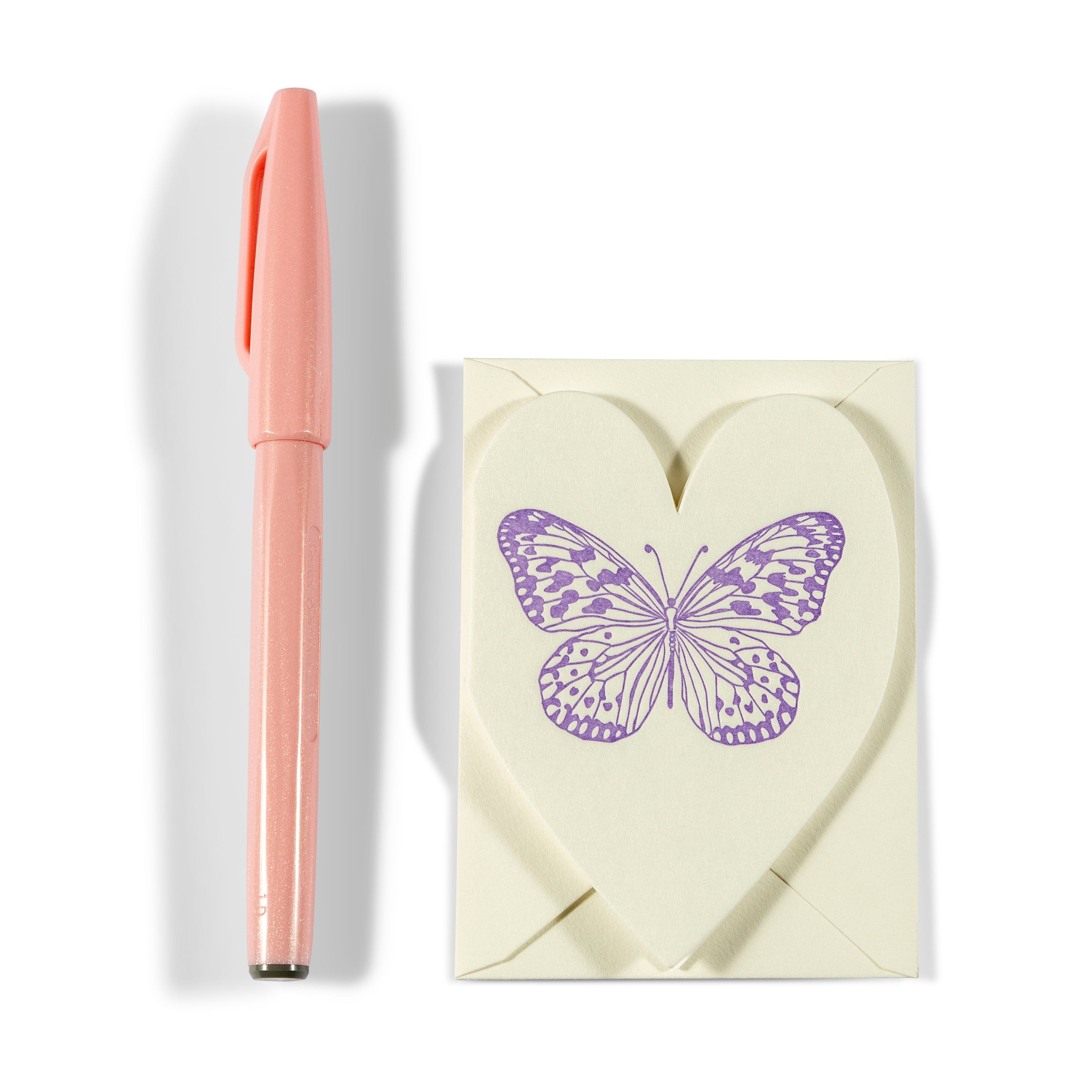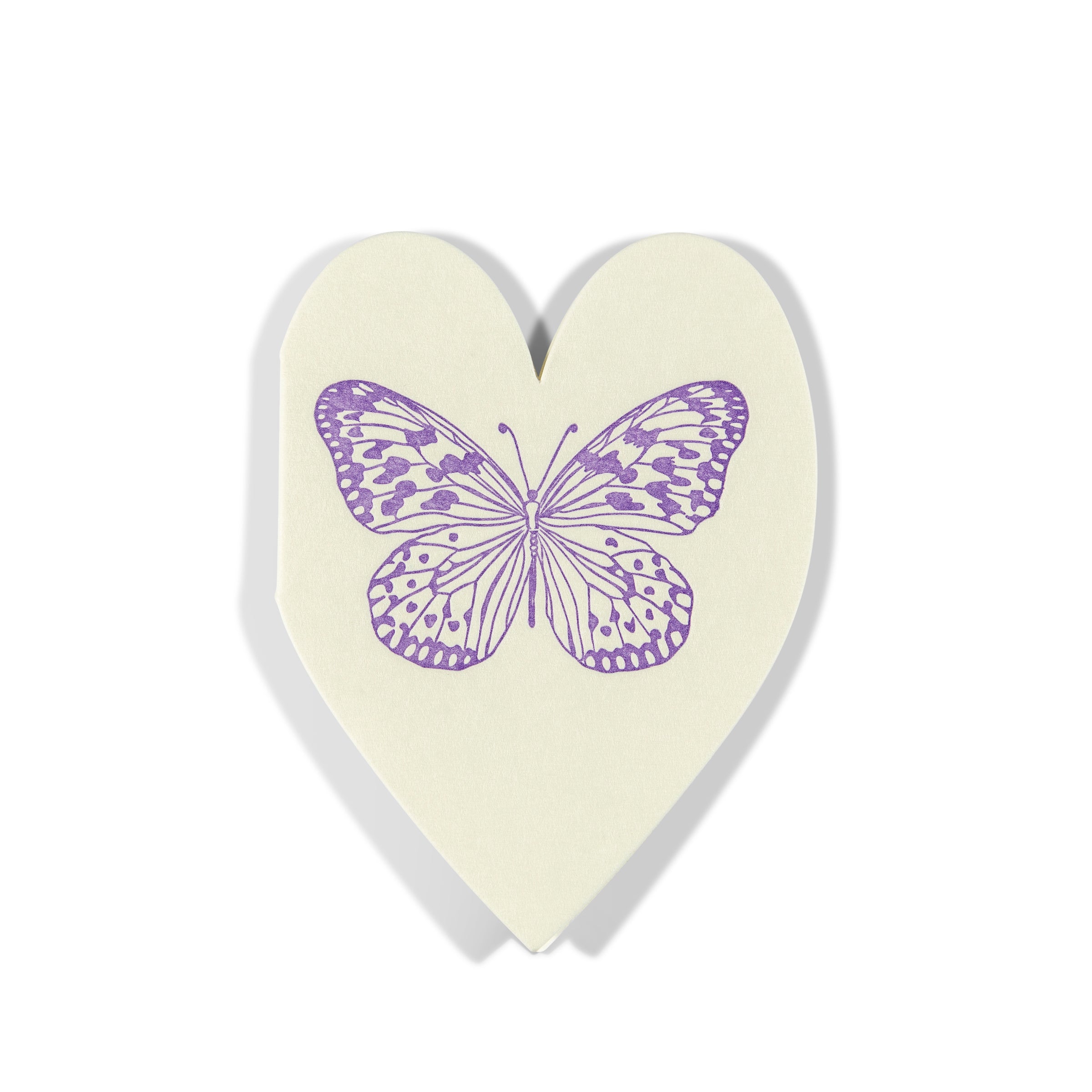 A delicate detail with a lovely message.This heart-shaped mini card features a finely drawn purple butterfly—symbolizing transformation, hope, or simply a sweet gesture of beauty. It’s perfect for tucking into a gift, bouquet, or lunchbox, or leaving behind as a little surprise. Each card comes with a petite envelope (2.625” x 3.625”) and is small enough to fit anywhere—but too small to mail.