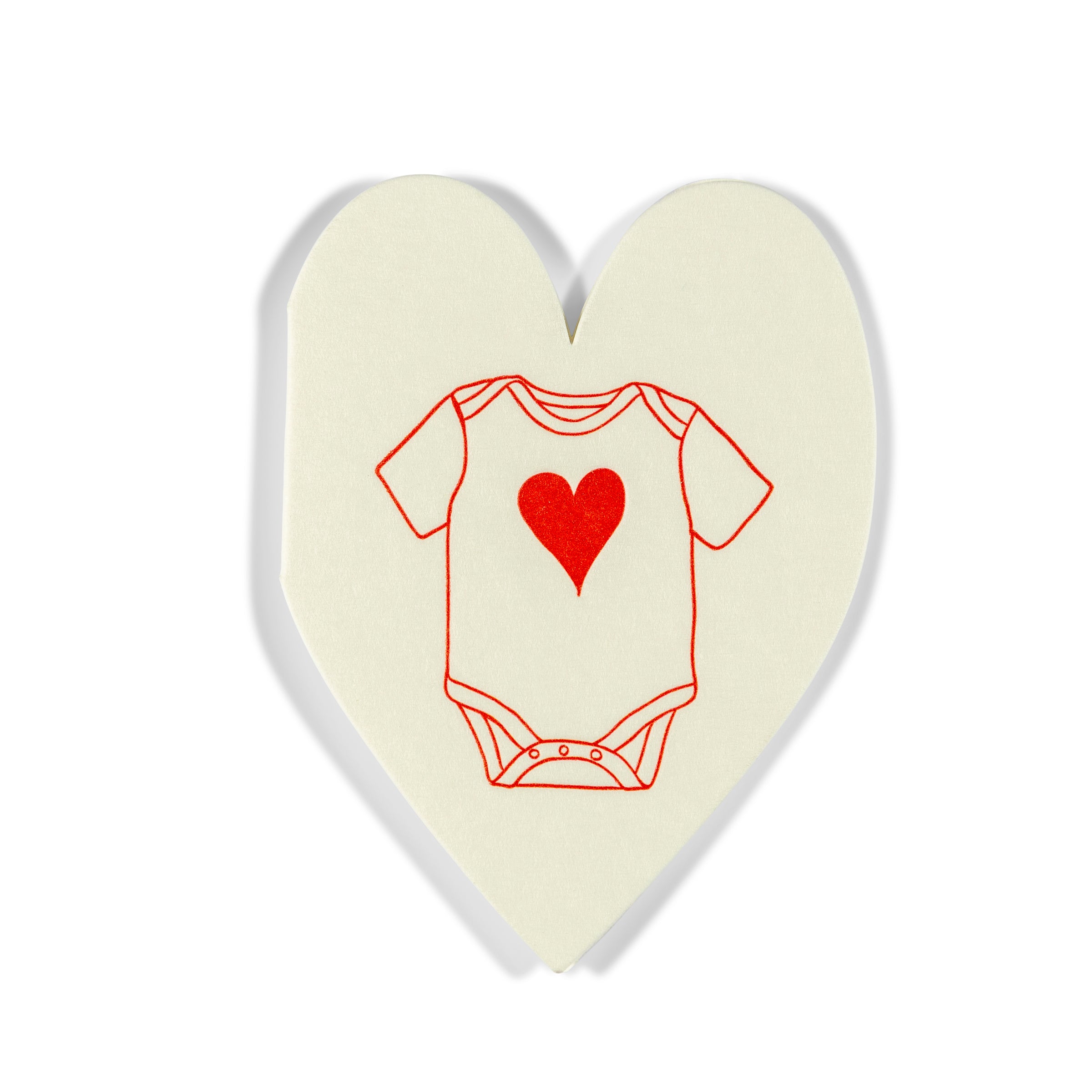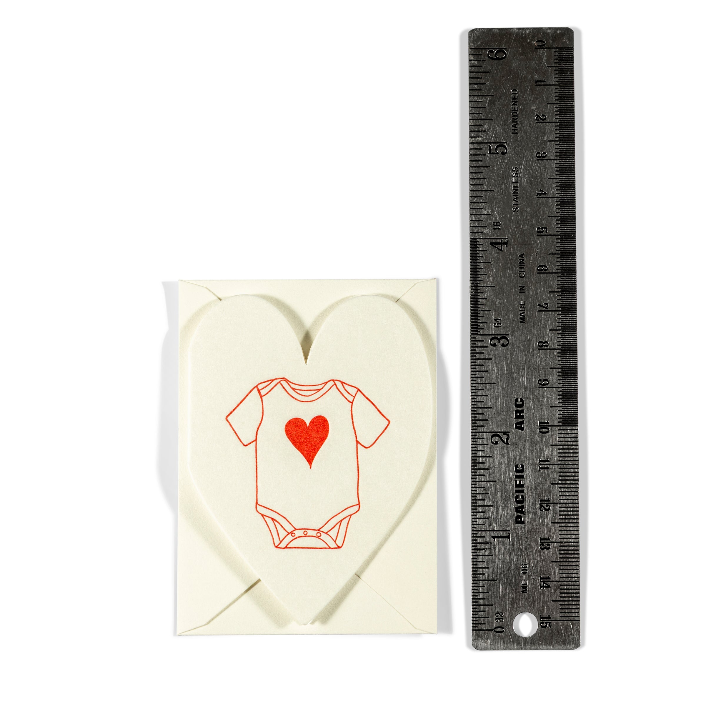 A tiny way to share big love.Our mini enclosure cards are the perfect size for slipping into a gift bag, baby shower favor, or sweet surprise for new parents. Each comes with a petite envelope (2.625” x 3.625”) and is too small to be mailed—but just right for adding a heartfelt touch. This heart-shaped design features a red onesie with a bold heart, making it a simple and darling pick for welcoming a new baby.